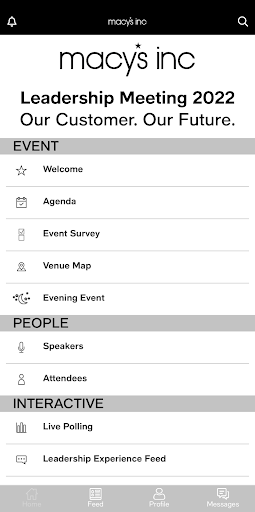 The Macy’s “Path to Growth” Leadership Meeting application brings the Leadership Meeting experience directly to your mobile device by offering an array of features including agendas, speaker bios, hotel information, and resources to enhance each moment of your attendance.